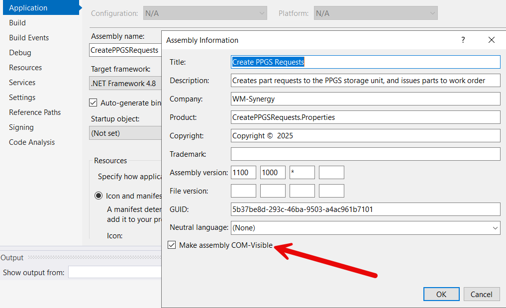 A Visual ERP Macro must be made as a COM compliant .dll. In order to do this, the developer should set the following at the project level: