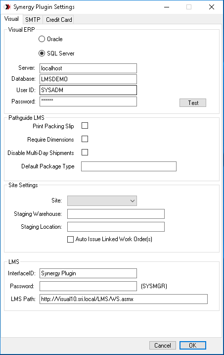 Click the Setup button to configure which Visual database should be used and the http path to LMS IIS site. Use the test buttons to validate database and IIS connectivity.