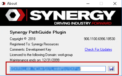 During the save process, the key will be validated and if valid a local license file will be created in the root directory; SynergyPathGuidePluginLic